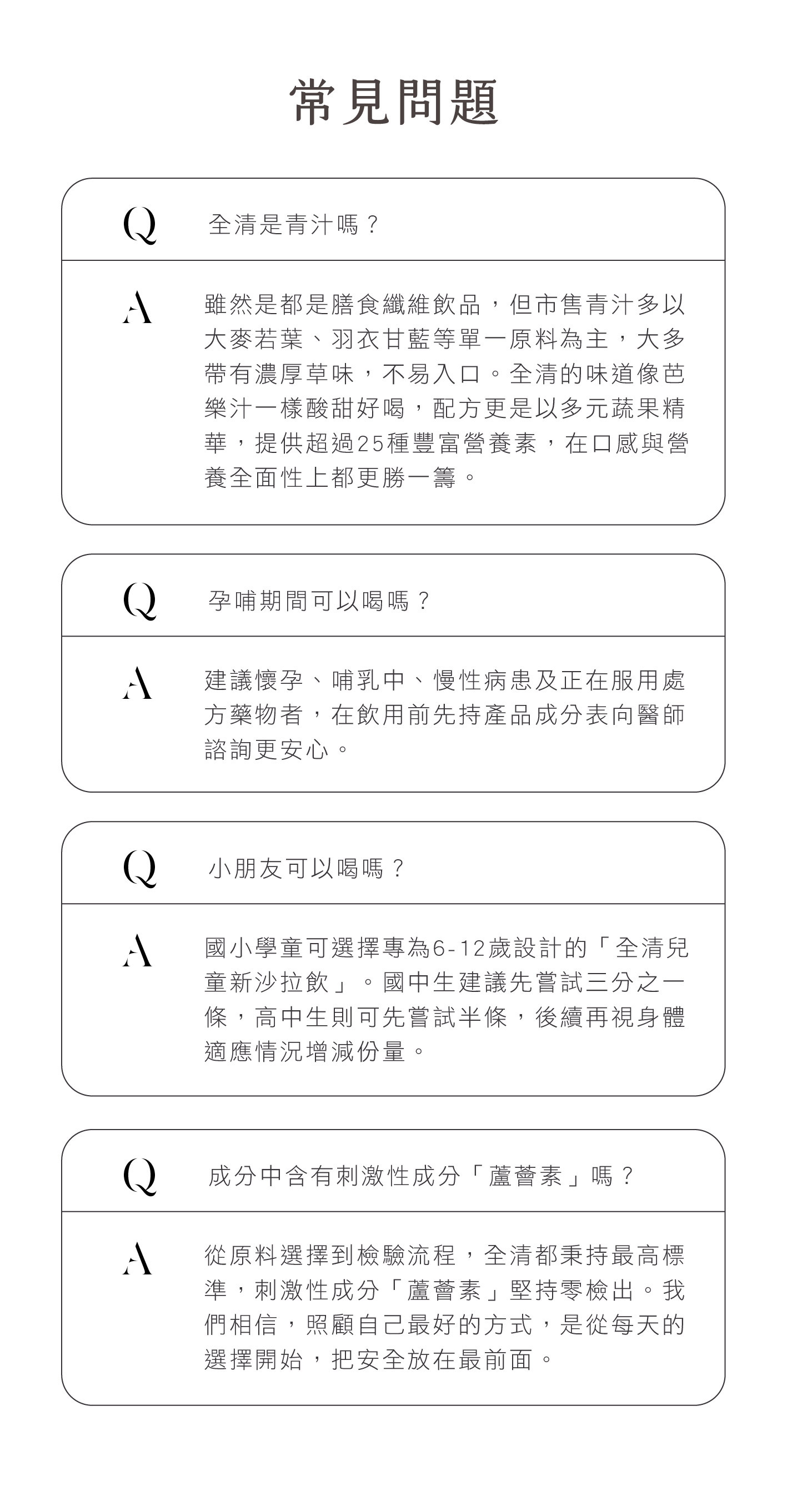 商品內容物:全清高纖新沙拉飲 30 條(不含玻璃水瓶)